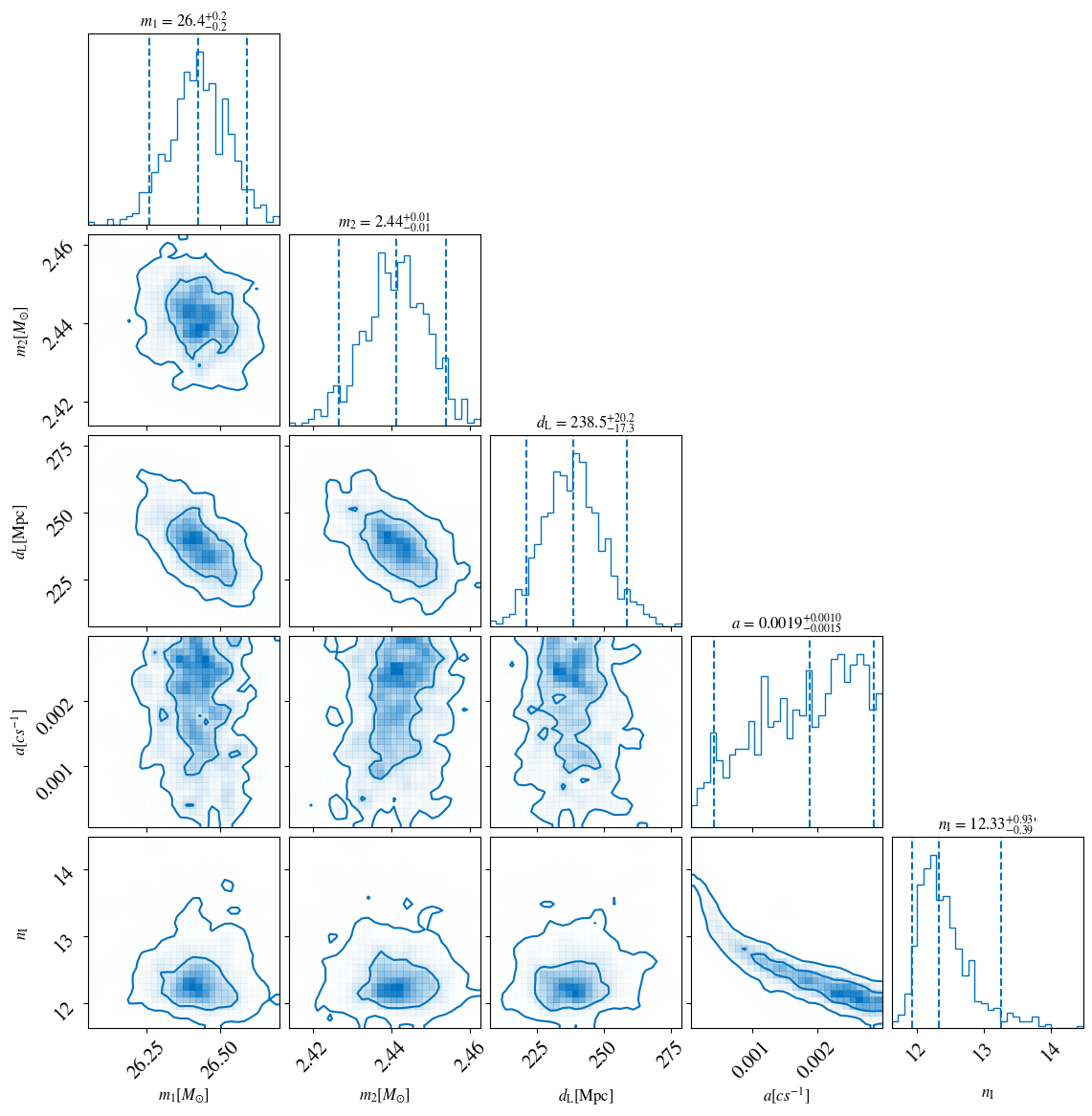 Figure 3: Parameter estimates for GW190814, including the masses of the two black holes (*m*~1~ and *m*~2~), luminosity distance (*d*~L~), line-of-sight acceleration (*a*), and power-law index (*n*~I~). Dashed lines indicate median values and 90% confidence intervals. Contour plots show 50% and 90% confidence ranges. (Image by SHAO)