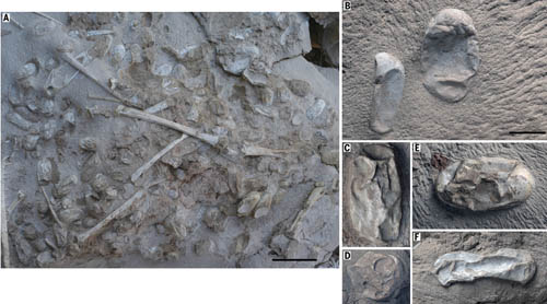 Fig. 2 Eggs preserved with pterosaur bones (IVPP V 18942). (A) Close-up of egg concentration, scale bar 100 mm; (B to F) selected eggs, Scale bar 20 mm. (Image by WANG Xiaolin)