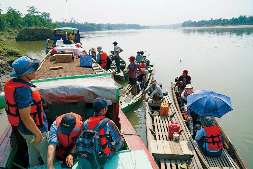In the scorching heat at noon, researchers ducked into the shade of a big tree and concentrated their eyes and ears on the water’s surface. The crackling and breaking of bamboo and trees by wild elephants in the distant forest could be heard. The wild animals in the valley seemed stuck at home due to the burning sun— only some white-breasted kingfisher (Halcyon smyrnensis) and white-crowned forktail (Enicurus leschenaulti) were still active on the other side of the river. As some researchers began to doze off, boat captain Kyaw Thu suddenly pointed at the trees on the other side of the river. An oriental pied hornbill (Anthracoceros albirostris) was picking the fruit of a banyan tree. Soon after the bird left, the top of the trees began shaking from a group of rhesus monkeys (Macaca mulatta), one of which eyed the team from behind the branches.