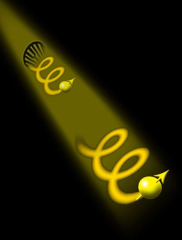 Quantum teleportation processing photo of single-photon spin and orbital angular momentum: Photon with orbital angular momentum transmits onward in a helical line; the spin angular momentum carried by the photon is indicated by an arrow.