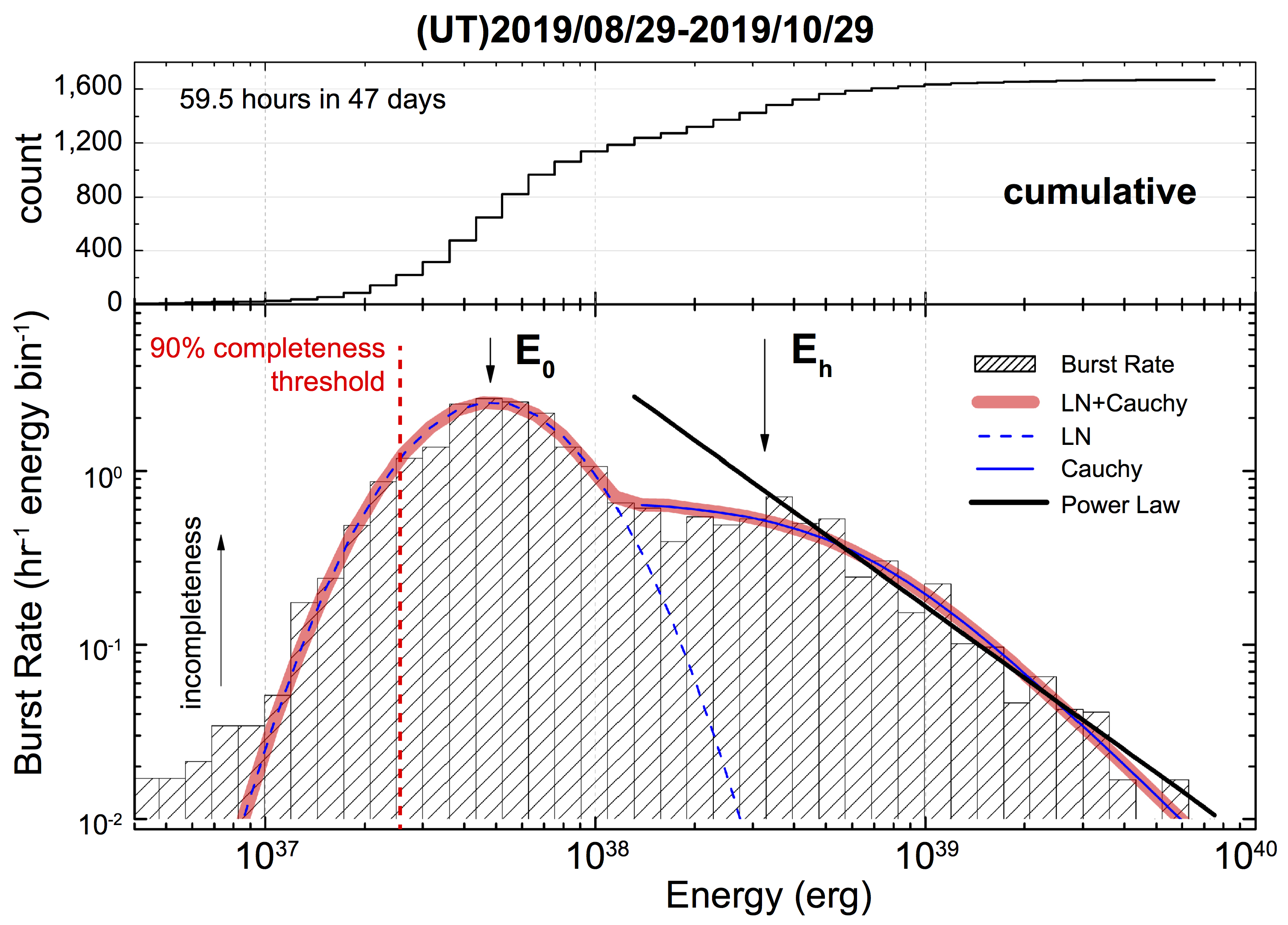 Such high cadence facilitates a statistical study of these FRB bursts. The researchers found a clear characteristic energy of E0= 4.8 × 1037erg, below which the generation of the bursts became less efficient. The burst energy distribution can be adequately described as bimodal, namely, a log-normal function for low E bursts and a Lorentz function for high E bursts, implying that weaker FRB pulses may be stochastic in nature and the stronger ones involve a ratio between two independent quantities.