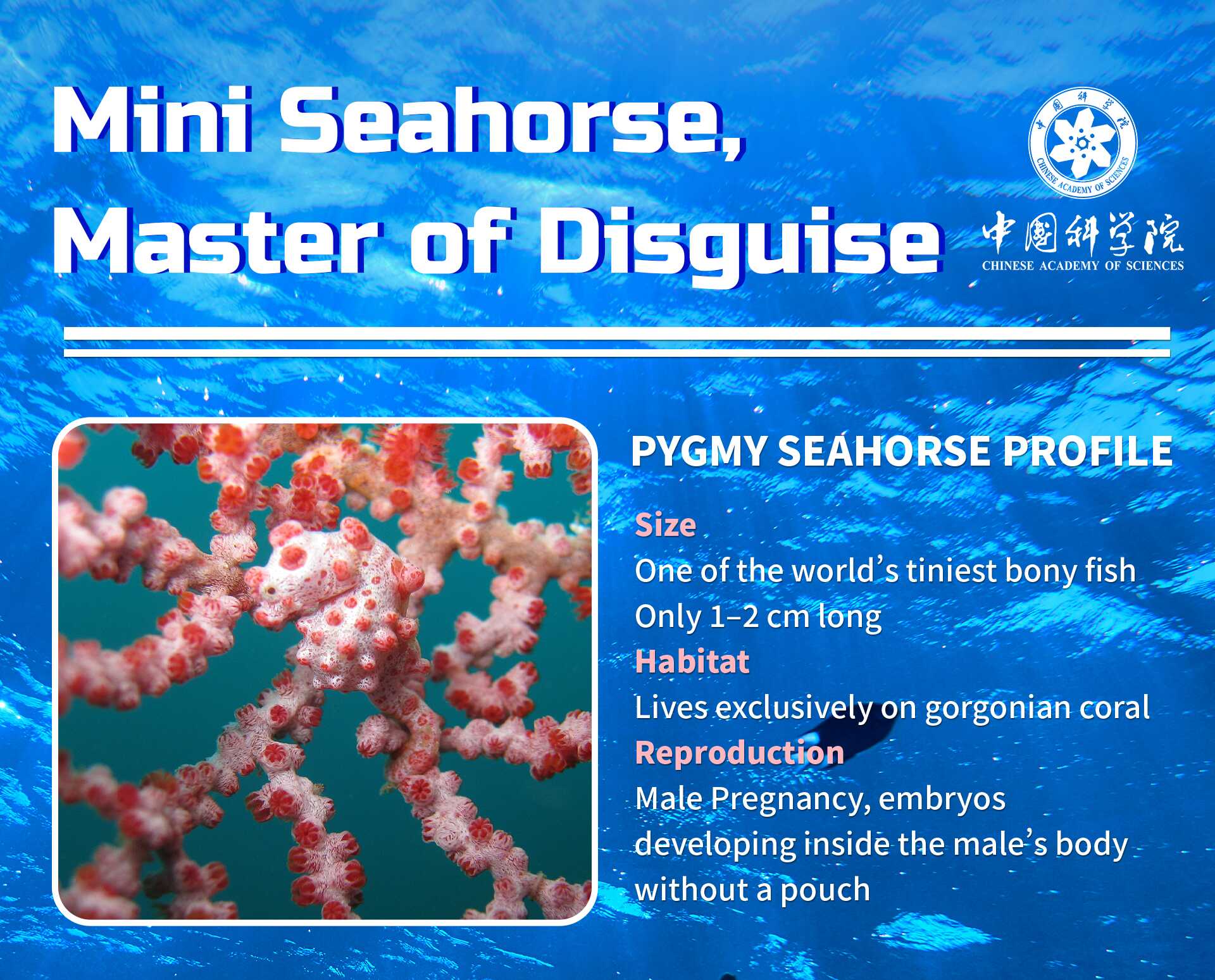 Can you spot it among the corals? This tiny seahorse is nearly invisible! One of the smallest bony fish known, it grows only 1–2 cm and spends its entire life on gorgonian corals.