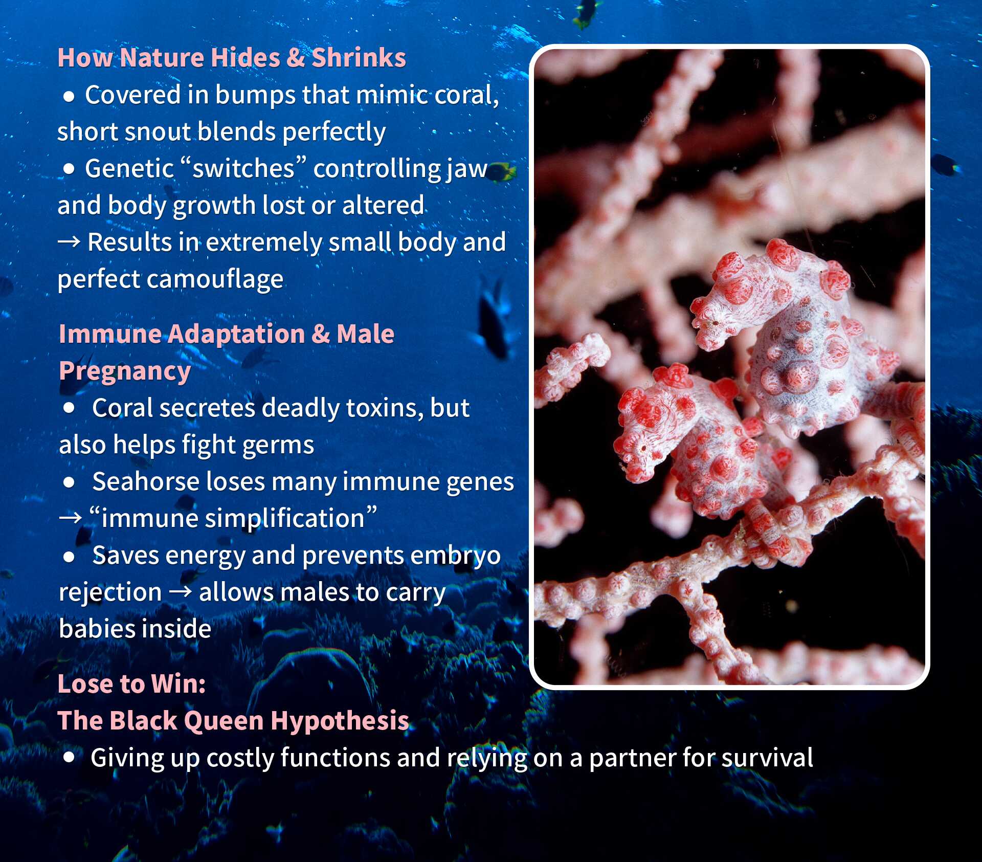 The pygmy seahorse has lost key genes controlling body size and craniofacial development, resulting in its tiny body and unique face. Skin genes evolved to match the coral's color and texture almost perfectly.