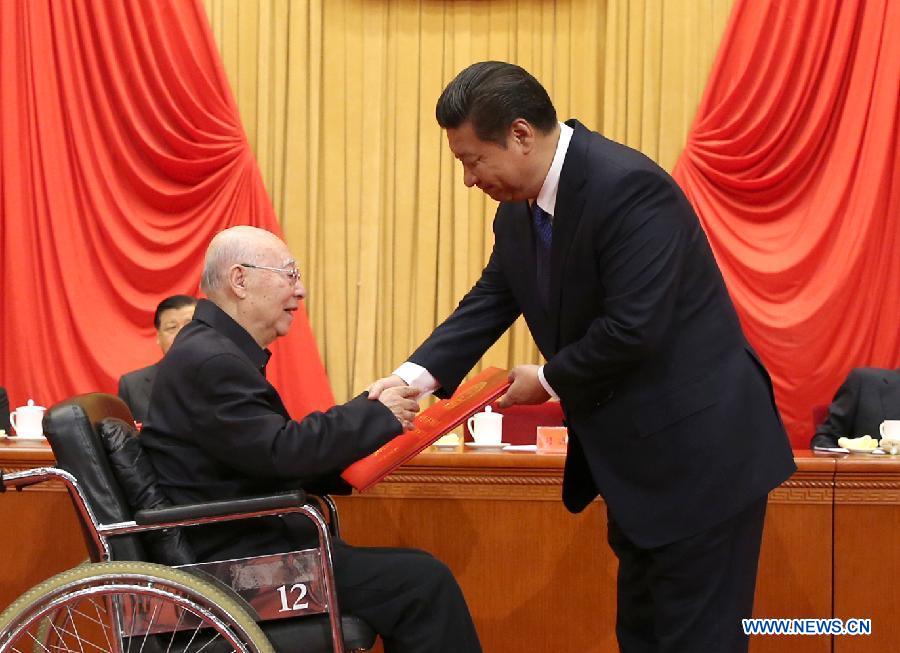 Chinese President Xi Jinping (R front) presents China's top science and technology accolade to nuclear physicist Yu Min, an academician at the Chinese Academy of Sciences, during the presenting ceremony of China's 2014 State Top Scientific and Technological Awards at the Great Hall of the People in Beijing, capital of China, Jan. 9, 2015. (Xinhua/Ma Zhancheng) |