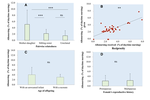 Fig. 2 Factors affecting the extent of allomaternal nursing (allonursing): (A) increased allomaternal nursing within mother-daughter dyads, (B) positive relationship between mother's and allonurser's pattern of reciprocal allomaternal nursing (C) no difference in allomaternal nursing proportions between females with an unweaned infant (approximately one year of age) and females with a neonate (< 6 months of age), (D) no difference in allomaternal nursing proportions between primiparous and multiparous mothers. (***, p < 0.001; **, p < 0.01; ns, no significance, p > 0.05). (Image by IOZ)