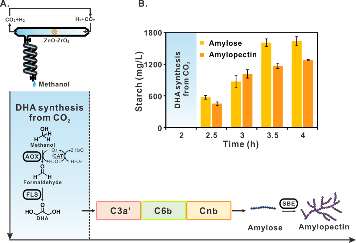 Starch is the major component of grain as well as an important industrial raw material. At present, it is mainly produced by crops such as maize by fixing CO2 through photosynthesis. This process involves about 60 biochemical reactions as well as complex physiological regulation. The theoretical energy conversion efficiency of this process is only about 2%.