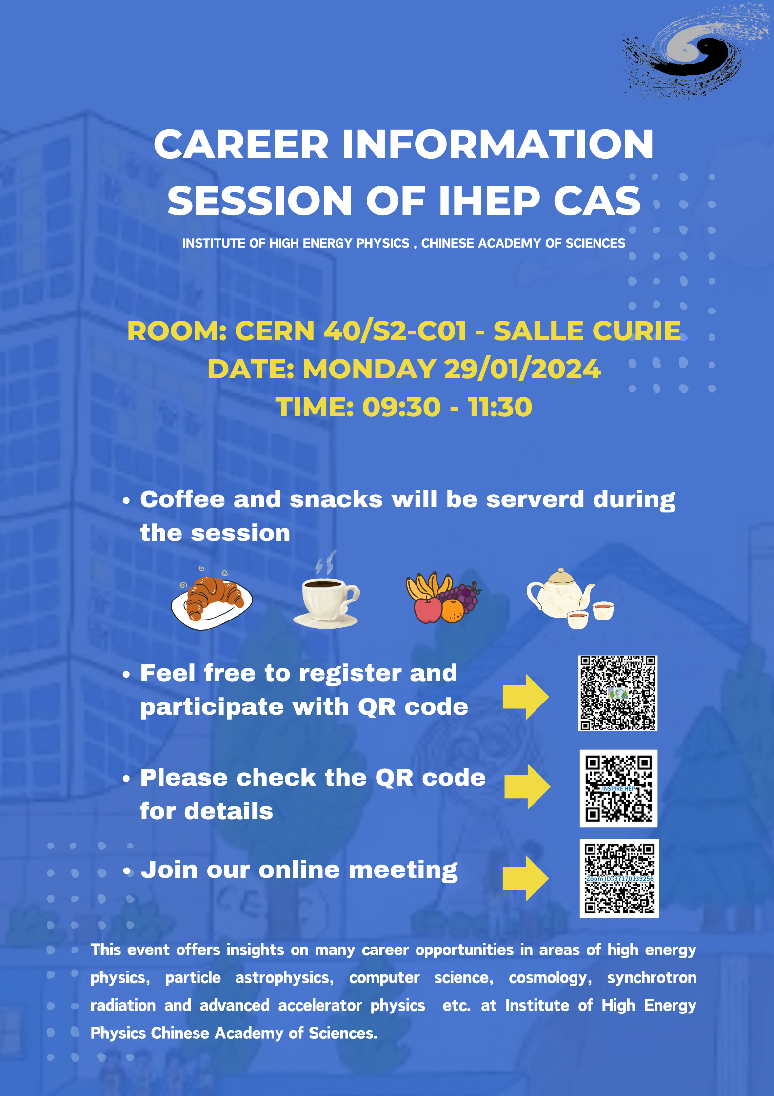 This event will provide insights into career opportunities at IHEP, with short presentations from different IHEP departments. Presentations will cover available positions and research programs related to the JUNO, BES, CEPC, CSNS, HEPS, LHAASO, AliCPT, eXTP, HERD, ATLAS, CMS, and LHCb experiments, as well as with accelerators, computing, and other areas. The event will also include a discussion session to answer questions from the audience .