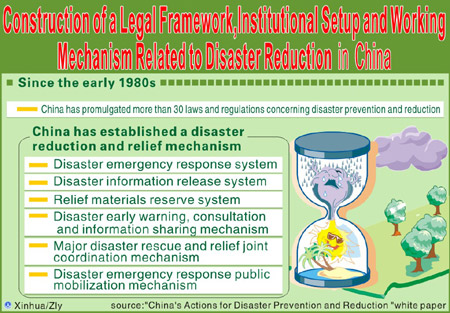 Given that many kinds of wide-ranging disasters frequently hit China and caused huge losses, China's main tasks were to strengthen its ability to manage potential risks of natural disasters, to monitor and forecast natural disasters, to prevent them and conduct rescue and relief, the report said.
