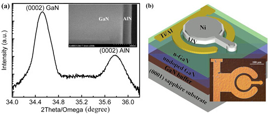 Figure 1: (a) (0002) plane 2& theta;-& omega; scan of AlN/n-GaN structure x-ray analysis. Inset: cross-sectional SEM image. (b) Schematic configuration of AlN/n-GaN MIS device. Inset: metallographic micrograph of MIS cell. (Image by SKLLA)
