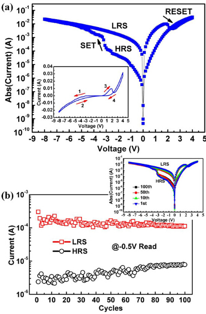 Figure 2: (a) Typical current-voltage (I-V) curve of pristine AlN/n-GaN MIS device shown in semi-logarithmic scale. Direction pointed by red arrows numbered 1 to 4 in inset is sequence of sweeping voltage. (b) Endurance performance of AlN/n-GaN MIS device. Inset: representative I-V curves of 100 sweeping cycles. (Image by SKLLA)