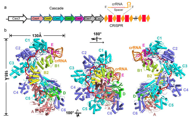Figure: Crystal structure of the Cascade complex from E. coli. a, The I–E subtype CRISPR system in E. coli (K12) consists of eight Cas proteins and CRISPR locus. b, Overall structure of the Cascade complex.(Image by WANG Yanli et.al)