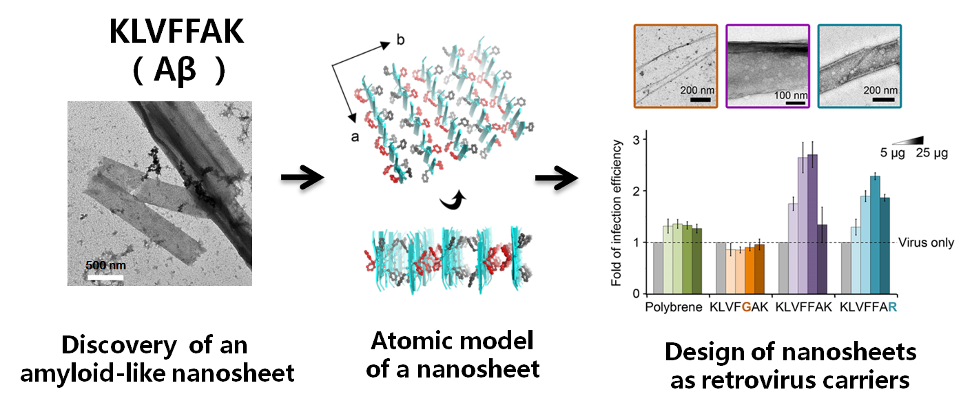 In this work, LIU Cong and co-workers discovered a previously unreported giant nanosheet structure. The structure is self-assembled by an amyloidogenic peptide of Abeta which forms amyloid aggregates found in the brains of Alzheimer’s patients. The researchers characterized the structure of the nanosheet by multiple approaches and built an atomic model. Based on the structural model, they designed and utilized the nanosheet as a highly effective enhancer for retrovirus transduction. A series of artificial peptides capable of forming amyloid-like nanosheets were further designed and characterized.