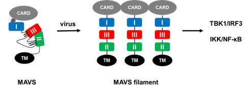 Upon viral infection, RIG-I induces MAVS to form prion-like filaments. Consequently, MAVS becomes active to stimulate downstream signaling effectors, such as IKK and TBK1. Prion-like filament formation of MAVS does not involve protein upregulation or post-translational modification, raising an important question on how MAVS activity is regulated during the process.
