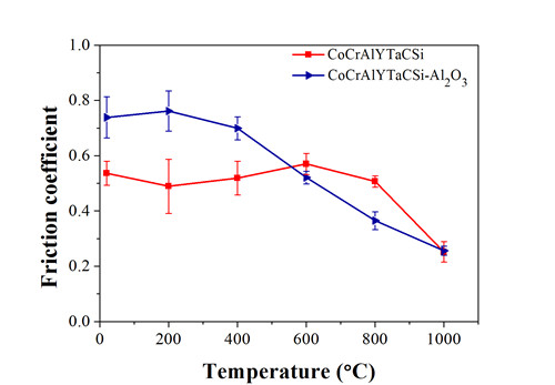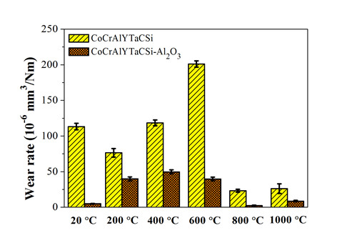 Both CoCrAlYTaCSi coating and CoCrAlYTaCSiAAl2O3 coating have a low friction coefficient of about 0.25 when they slide against Si3N4 ball at 1000°C, which could be attributed to the formation of ‘glazed layers’ on sliding surfaces and to the self-lubricity of the coatings thereat. Besides, CoCrAlYTaCSiAAl2O3 coating has better wear resistance than CoCrAlYTaCSi coating under the same sliding conditions, which is attributed to the significantly increased hardness and greatly improved mechanical properties of the coating associated with Al2O3 dispersion strengthening.