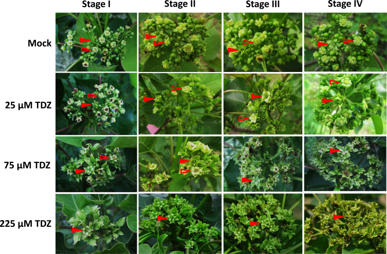 The study showed that TDZ treatment increased the number of female flowers by promoting pistil development and induced bisexual flowers by reversing stamen abortion during Jatropha flower development, which indicated that Cytokinin was required for development of both pistils and stamens in Jatropha. As both female and bisexual flowers influence seed yield, TDZ treatment can significantly increase the number of fruits, and thus final seed yield.