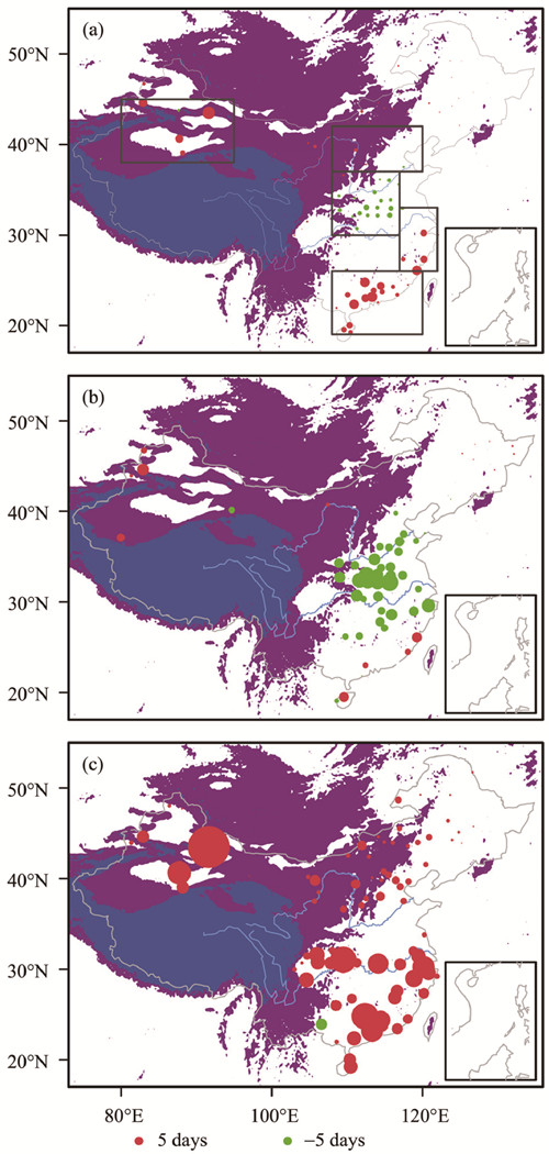 Figure 1. Linear trends in the number of extreme heat days (with maximum temperature greater than 35°C) for the years from (a) 1958 to 2008, (b) 1958 to 1983, and (c) 1984 to 2008. The marks are proportional to the values of the trend, with red dots for positive values and green dots for negative values. Only the stations with a significant trend level above 95% are displayed. Units: d/10 yr. (Wei and Chen, 2009).