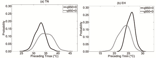 Figure 3. Probability distribution of the preceding (a) maximum temperature (Tmax; units: °C) for Beijing tropical nights and (b) minimum temperature (Tmin; units: °C) for Beijing extreme heat under conditions of higher humidity (solid lines) and lower humidity (dashed lines).(Chen and Lu, 2014b).