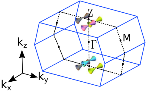 They found that the energy bands crossover around the critical pressure Pc = 1.23 GPa, as shown in Fig. 1. With increasing pressure, the band reversal occurs at the Z point and evolves into 4 twofold-degenerate Dirac cones around the Z point, suggesting that pressured black phosphorus is a 3D Dirac semimetal. A clear Lifshitz transition occurs at Pc from semiconductor to 3D Dirac semimetal. The Dirac cones are sketched as in Fig. 2.