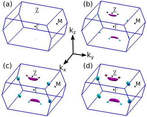 Figure 2. Sketched distribution of four Dirac cones in the first Brillouin zone of bulk black phosphorus under hydrostatic pressure P= 2 GPa. (Image by GONG Penglai)