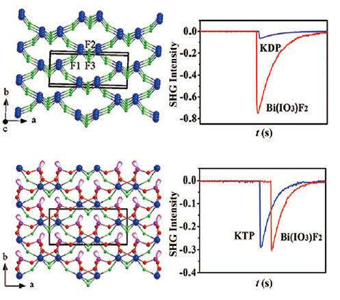 Prof. MAO Jianggao and his group from the State Key Laboratory of Structural Chemistry, Fujian Institute of Research on the Structure of Matter, Chinese Academy of Sciences, have obtained the first metal iodate fluoride, i.e. Bi(IO3)F2 with a very strong SHG effect through the introduction of F- as an independent anion into bismuth iodate.