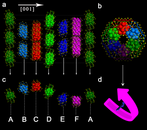 Figure.2 6HLH crystallographic arrangement of Au60S6(SCH2Ph)36 nanoclusters. (a) The stacking sequence along the [001] direction; (b) Front and (c) side views of the left-handed helical arrangement of Au60S6(SCH2Ph)36 nanoclusters; (d) the illustration of the left-handed helix. Note: To highlight the 6HLH arrangement, the Au atoms of the nanoclusters in each close-packed plane are labeled in different colors (Image by GAN Zibao).
