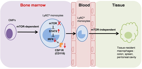 Further studies showed that mTOR deficiency significantly reduced M-CSF receptor CD115 expression at the transcriptional and translational levels. The molecular mechanism studies indicate that mTOR masters monocyte development via STAT5-IRF8-CD115 pathway.