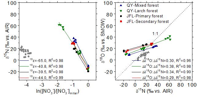 Although numerous studies of the N isotope effect focused on pure cultures of heterotrophic denitrifying bacteria, groundwater, sediments and agricultural soils, limited studies existed in forest soils.