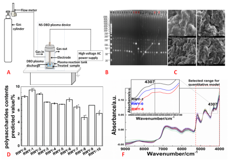 A. The schematic diagram of the home-made low temperature plasma mutagenesis device; B. RAPD verification of the mutant strains; C. SEM of the mycelium of the mutant Ganoderma lingzhi strains; D. Prediction of the polysaccharide content of the mutant Ganoderma lingzhi strain by NIR spectroscopy quantitative model; F. NIR spectra and characteristic bands of polysaccharides in Ganoderma lingzhi strains (Image by MA Yuhan)