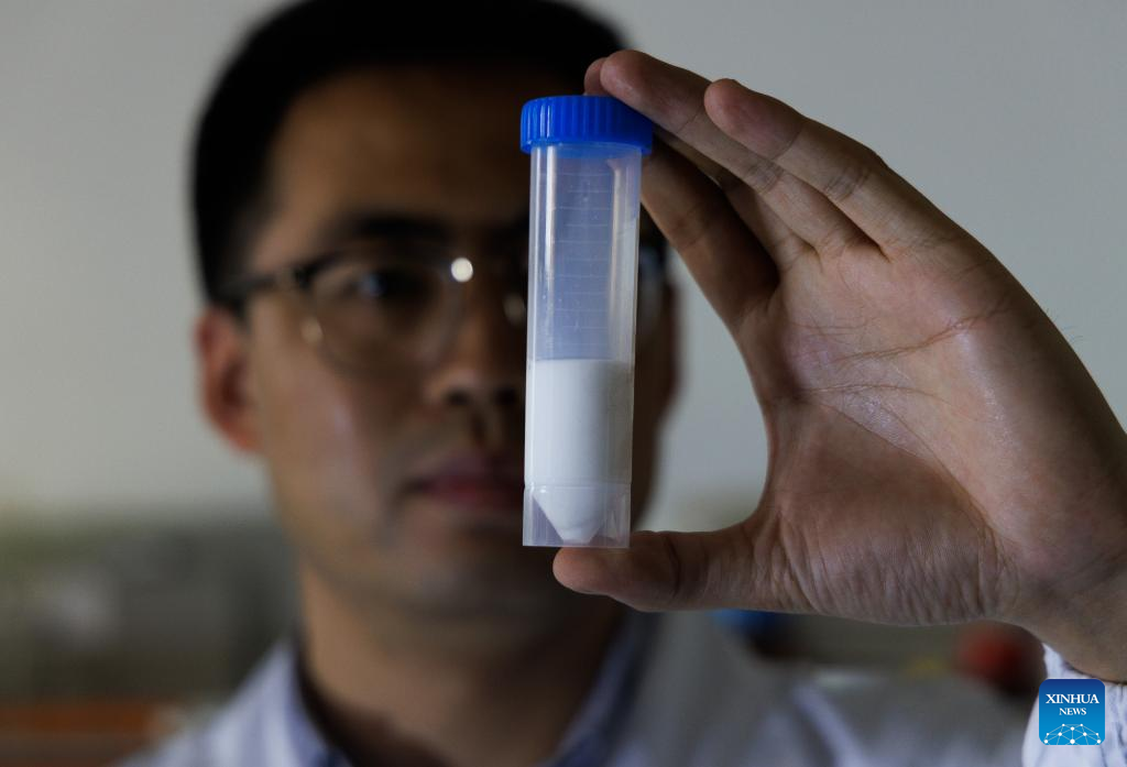 Researcher Song Yanlin shows products at the laboratory of the Institute of Chemistry, Chinese Academy of Sciences (ICCAS), in Beijing, capital of China, April 20, 2026. (Xinhua/Jin Liwang)