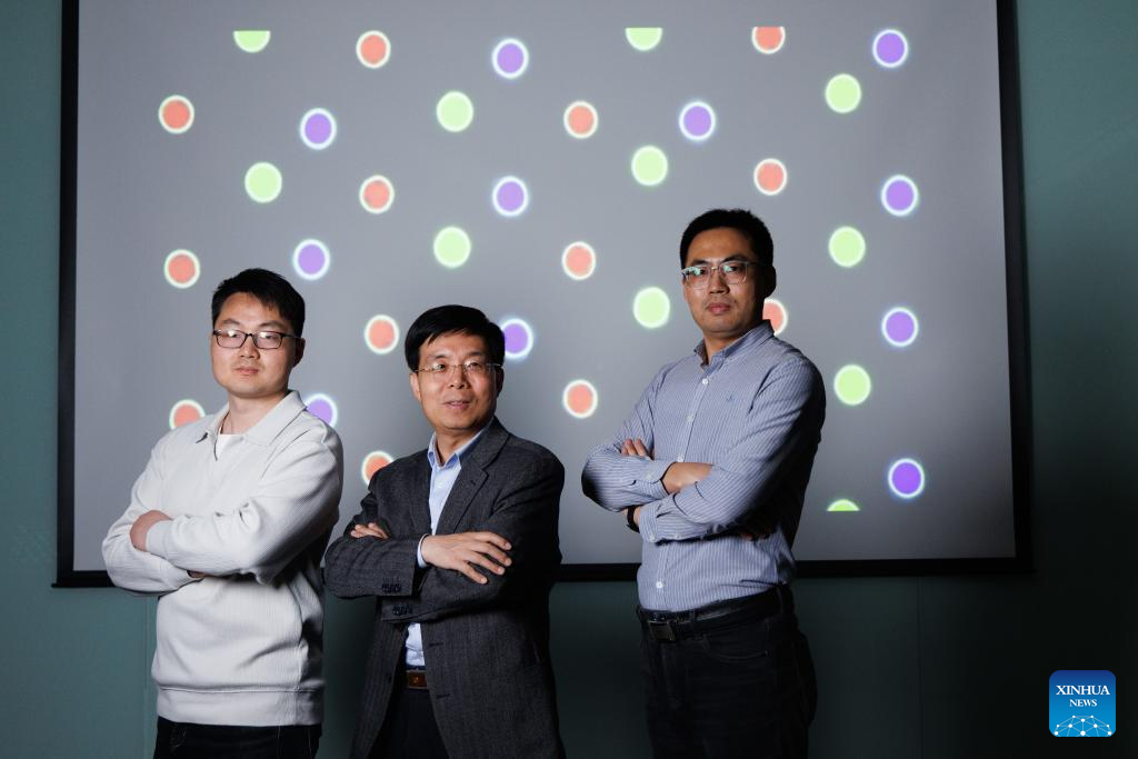 Researcher Song Yanlin (C), associate researcher Li Huizeng (R) and Doctor Li Kaixuan pose for photos at the laboratory of the Institute of Chemistry, Chinese Academy of Sciences (ICCAS), in Beijing, capital of China, April 20, 2026. (Xinhua/Jin Liwang)