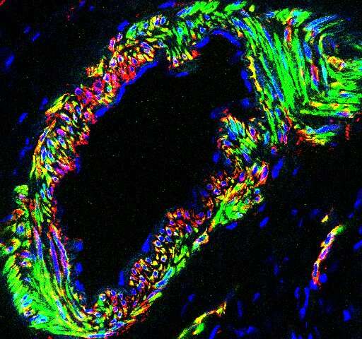 Immunofluorescence analysis of classic markers for smooth muscle cells in the ovary, including muscle filaments (green), smooth muscle proteins (red) and nuclear DNA (blue). [Photo/Liu Guanghui, Institute of Zoology]