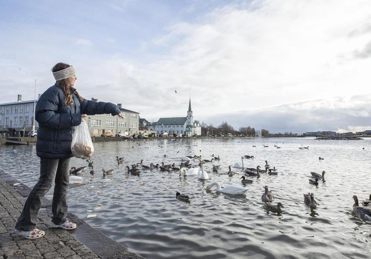 A girl feeds waterfowl at lake Tjornin in Reykjavik, Iceland, on March 15, 2025. (Xinhua/Zhang Fan)