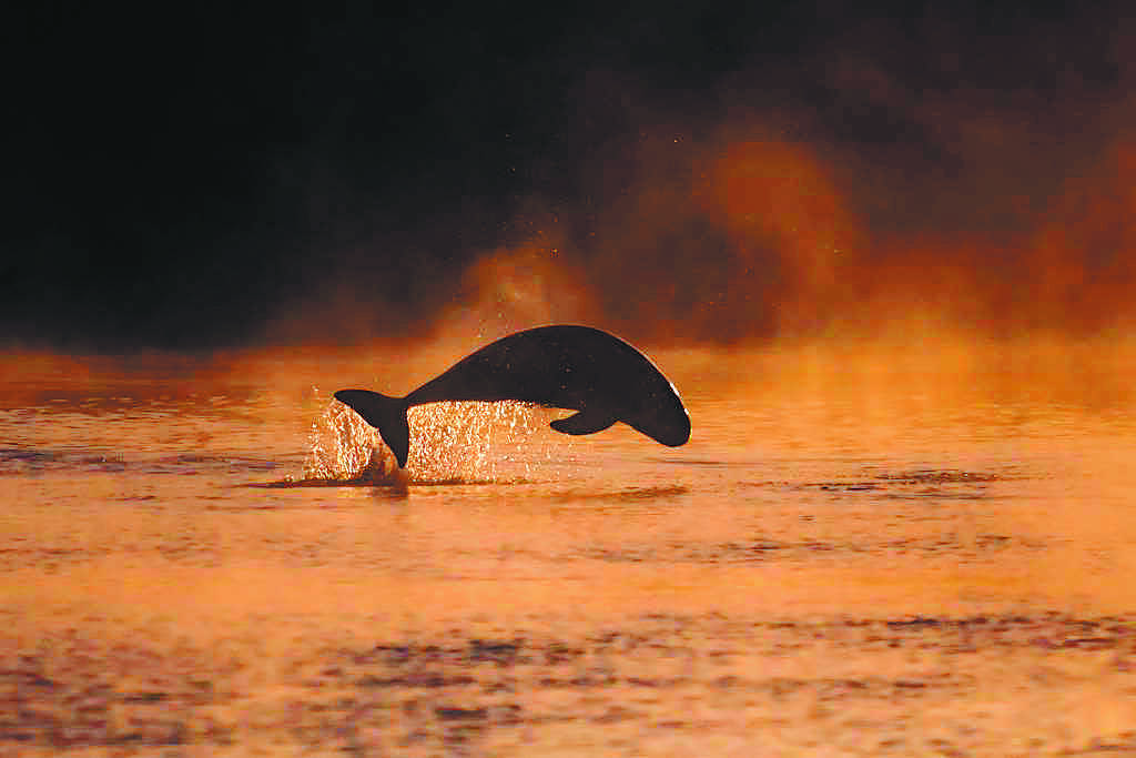 A Yangtze finless porpoise emerges from the water amid the morning mist in Poyang Lake, Jiangxi province, in Feb, 2021. YANG HE/FOR CHINA DAILY