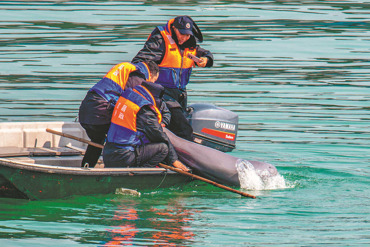 Staff members from the Yichang fishery administration rescues a Yangtze finless porpoise entangled in an abandoned string, in Hubei province, in Feb, 2022. YANG HE/FOR CHINA DAILY