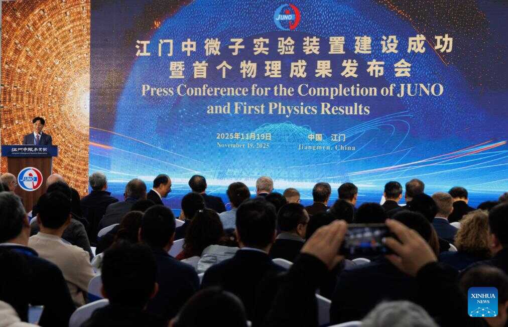 People attend a press conference reporting the first physics result by the Jiangmen Underground Neutrino Observatory (JUNO) in Jiangmen, south China's Guangdong Province, Nov. 19, 2025 (Xinhua/Jin Liwang)
