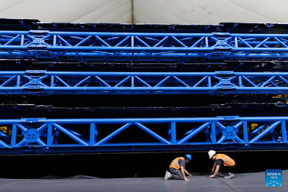 This photo taken on Nov. 18, 2025 shows workers laying floor mats at the hall of Jiangmen Underground Neutrino Observatory (JUNO), with three layers of muon detector arrays over their heads, in Jiangmen, south China's Guangdong Province. (Xinhua/Jin Liwang)