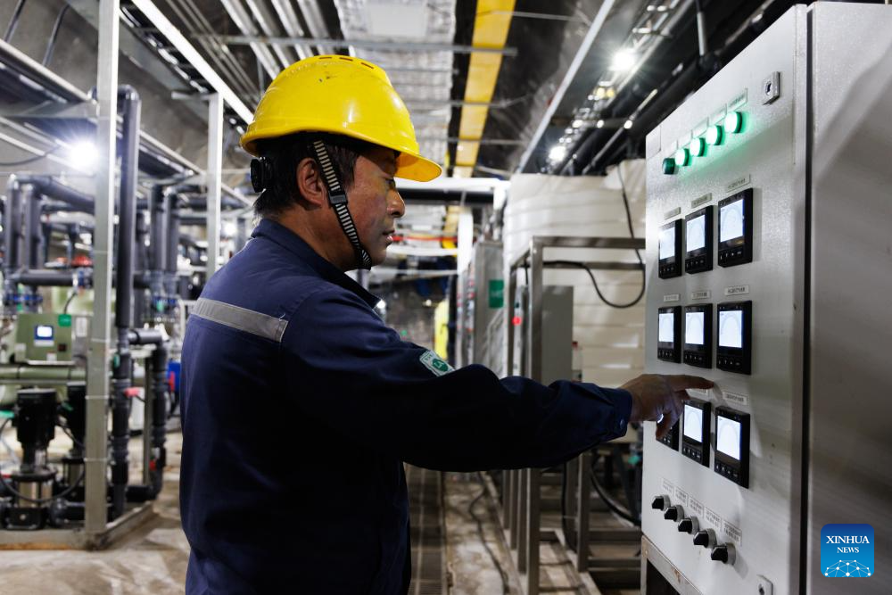 A worker monitors the ultrapure water treatment process at Jiangmen Underground Neutrino Observatory (JUNO) in Jiangmen, south China's Guangdong Province, Nov. 18, 2025. (Xinhua/Jin Liwang)