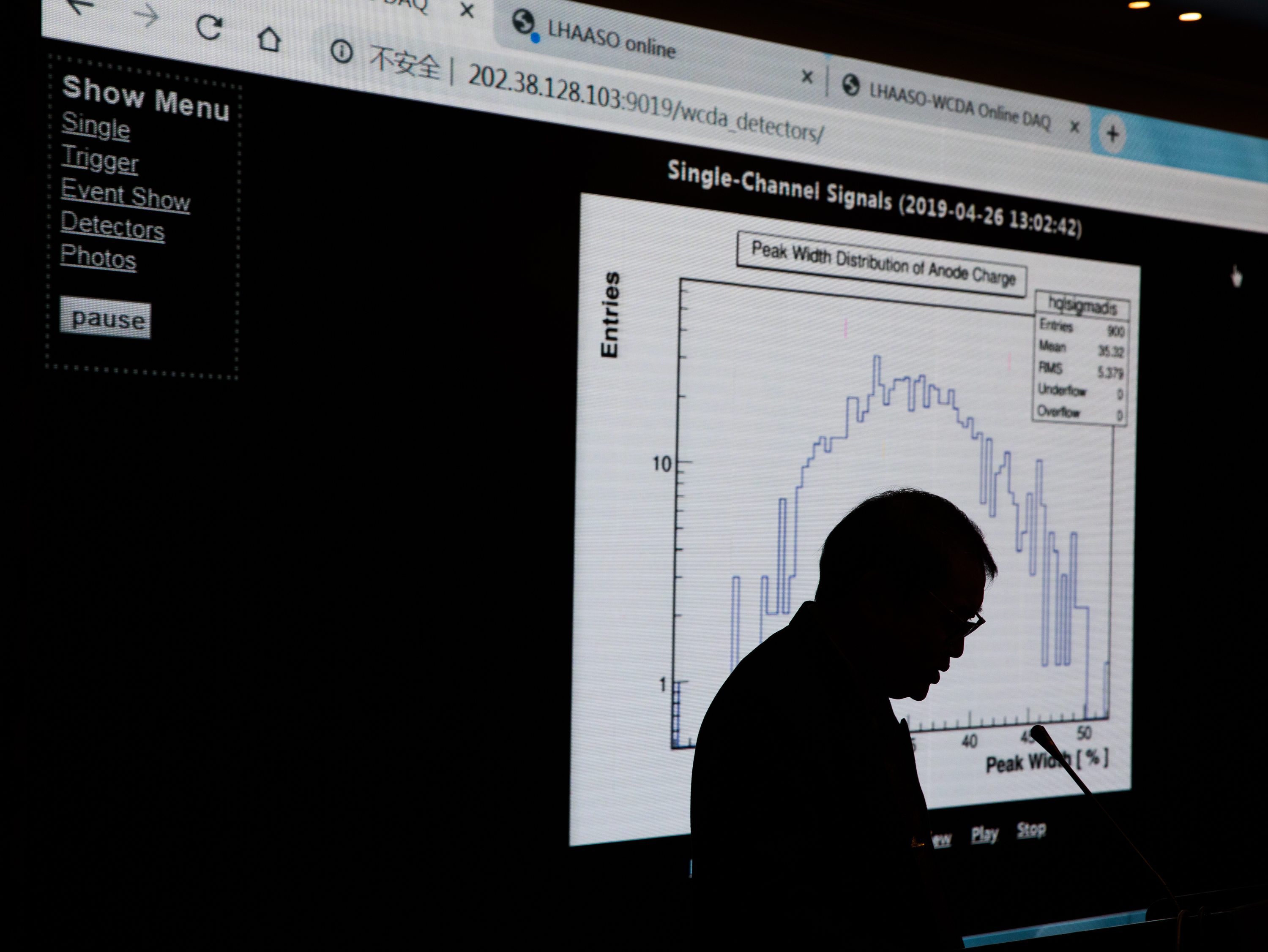Photo taken on April 26, 2019 shows CAO Zhen from the China Academy of Sciences, chief scientist of the Large High Altitude Air Shower Observatory (LHAASO), launching scientific observation and introducing the research data during the ceremony of LHAASO Scientific Observation and unveiling of Tianfu Cosmic Ray Research Center in Chengdu City, southwest China's Sichuan Province. The LHAASO recently began scientific observation of very high energy cosmic rays as it launched operation of its first set of detectors. (Xinhua/JIN Liwang)