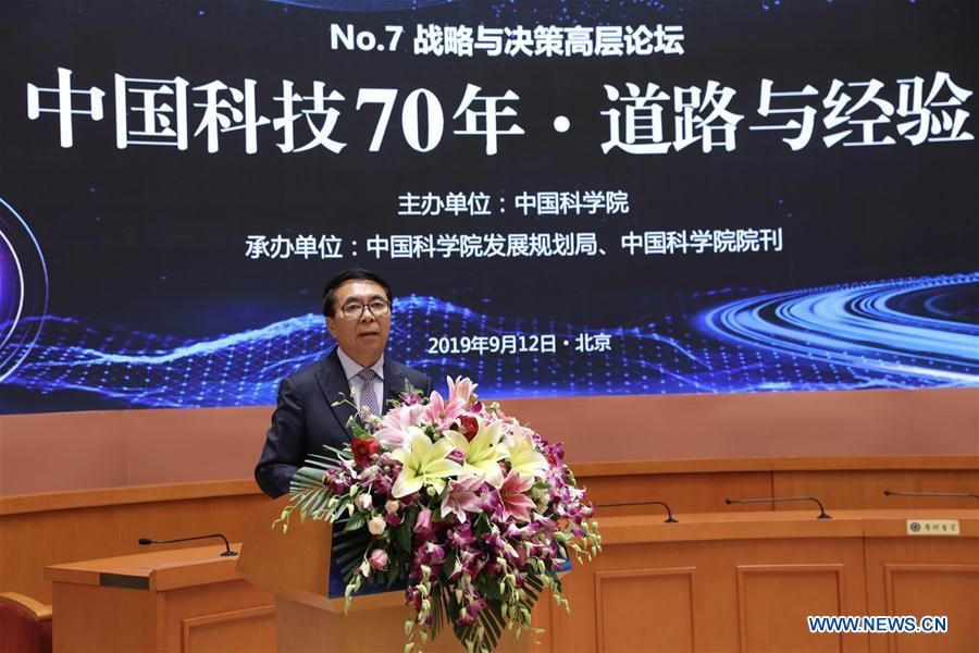 Bai Chunli, president of the Chinese Academy of Sciences (CAS) speaks during a strategy and policy high-level forum of CAS in Beijing, capital of China, Sept. 12, 2019. (Xinhua/Jin Liwang)