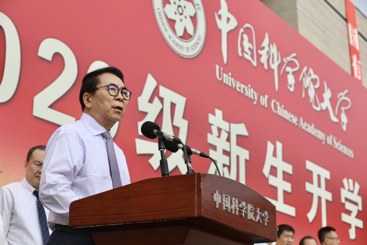 Bai Chunli, president of the Chinese Academy of Sciences, speaks during the opening ceremony held to welcome the 2020 freshmen at the Yanqi Lake campus of the University of Chinese Academy of Sciences in Beijing on Sept 13, 2020. [Photo by Zhu Xingxin/for chinadaily.com.cn]