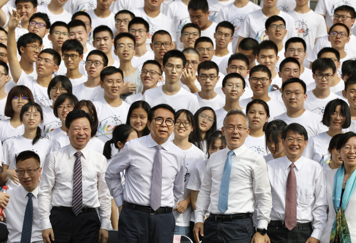 Bai Chunli (center), president of the Chinese Academy of Sciences, and Li Shushen (left), president of the University of the Chinese Academy of Sciences, pose for photo with freshmen at the Yanqi Lake campus of the University of Chinese Academy of Sciences in Beijing on Sept 13, 2020. [Photo by Zhu Xingxin/for chinadaily.com.cn]