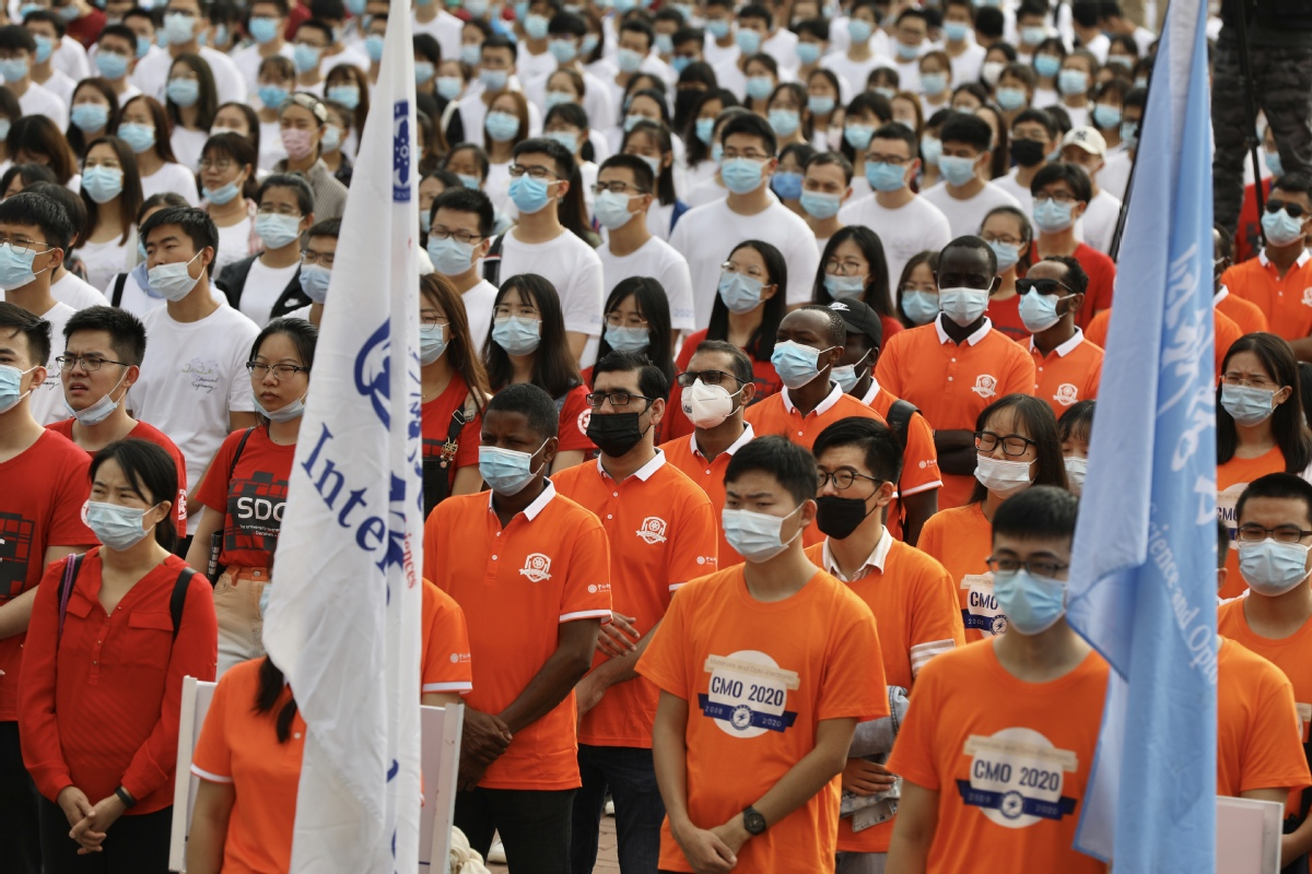Students wear face masks at the opening ceremony at the University of Chinese Academy of Sciences in Beijing on Sept 13, 2020. [Photo by Zhu Xingxin/for chinadaily.com.cn]