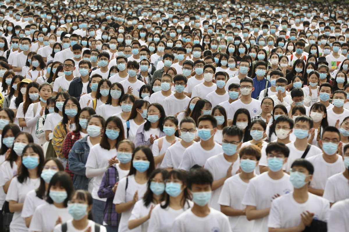 Freshmen wear face masks at the opening ceremony at the University of Chinese Academy of Sciences in Beijing on Sept 13, 2020. [Photo by Zhu Xingxin/for chinadaily.com.cn]