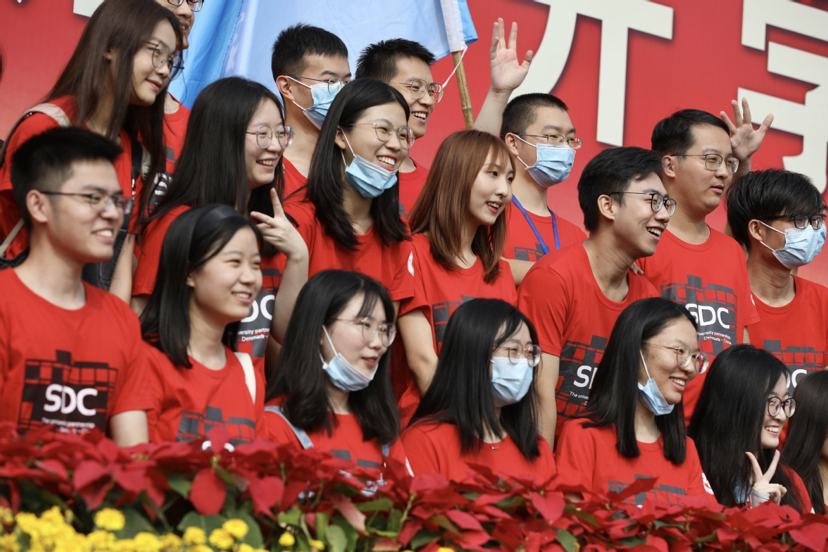 The freshmen pose for a group photo after attending the opening ceremony at the University of Chinese Academy of Sciences in Beijing on Sept 13, 2020. [Photo by Zhu Xingxin/for chinadaily.com.cn]