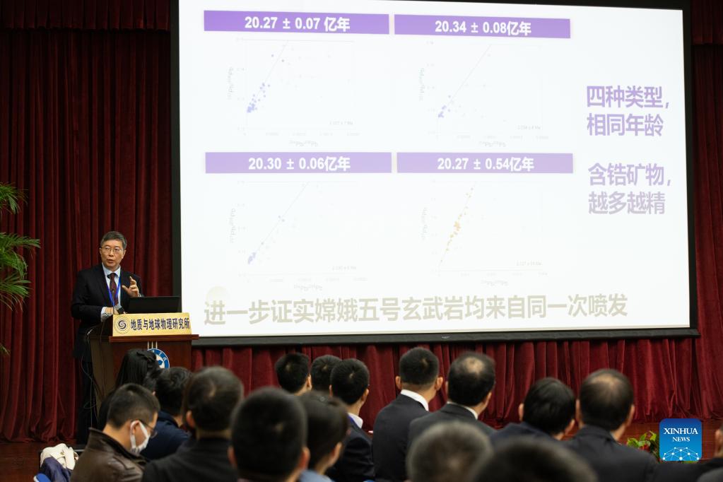 Li Xianhua, an academician with Chinese Academy of Sciences (CAS) who led the research team, introduces an analysis of moon rocks brought back to Earth by China's Chang'e-5 mission during a press conference held at Institute of Geology and Geophysics of the Chinese Academy of Sciences in Beijing, capital of China, Oct. 19, 2021. Chinese researchers have studied the lunar samples brought back by the Chang'e-5 mission and dated the youngest rock on the Moon at around 2 billion years in age, extending the "life" of lunar volcanism 800-900 million years longer than previously known. The study, conducted mainly by a research team at the Institute of Geology and Geophysics (IGG), Chinese Academy of Sciences (CAS), was presented in three Nature papers and published online Tuesday. (Xinhua/Jin Liwang)