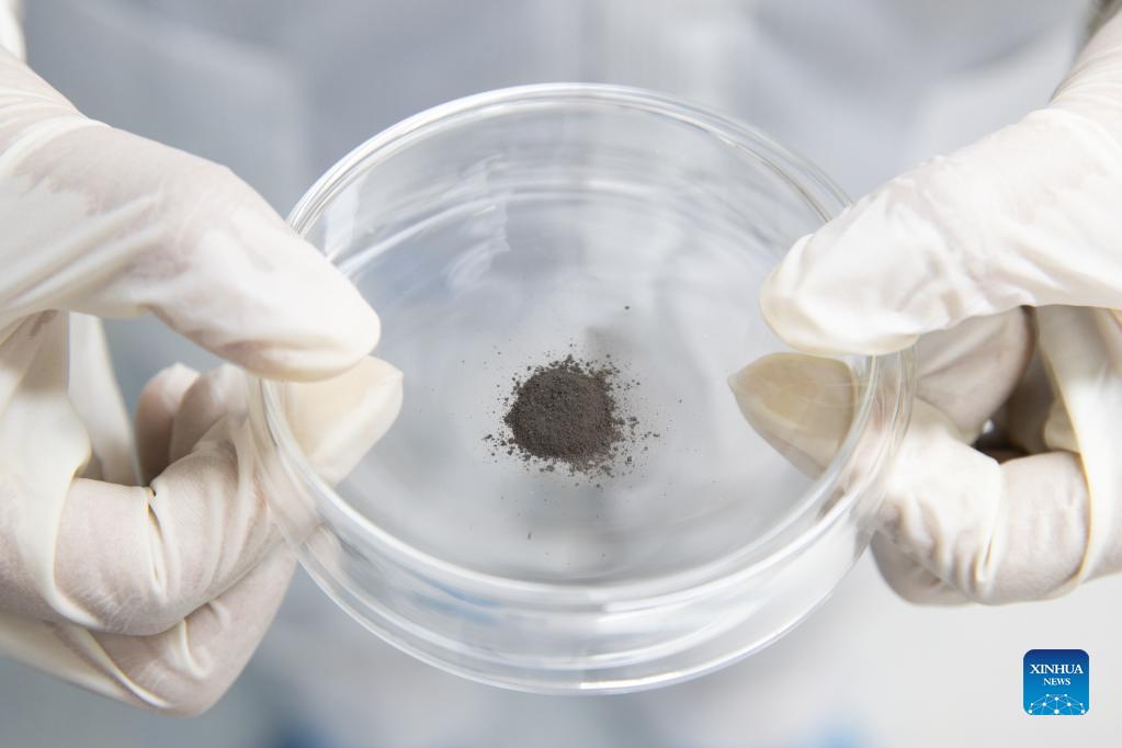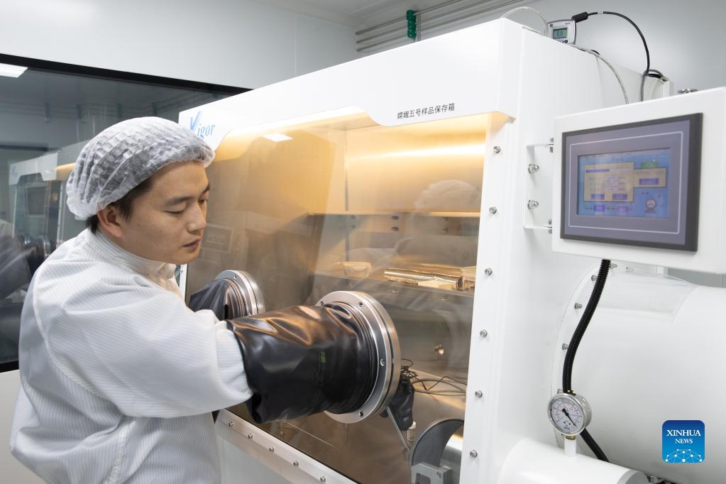 Tian Hengci, an associate research fellow, deals with lunar samples at the Institute of Geology and Geophysics of the Chinese Academy of Sciences in Beijing, capital of China, Oct. 15, 2021. Chinese researchers have studied the lunar samples brought back by the Chang'e-5 mission and dated the youngest rock on the Moon at around 2 billion years in age, extending the "life" of lunar volcanism 800-900 million years longer than previously known. The study, conducted mainly by a research team at the Institute of Geology and Geophysics (IGG), Chinese Academy of Sciences (CAS), was presented in three Nature papers and published online Tuesday. (Xinhua/Jin Liwang)