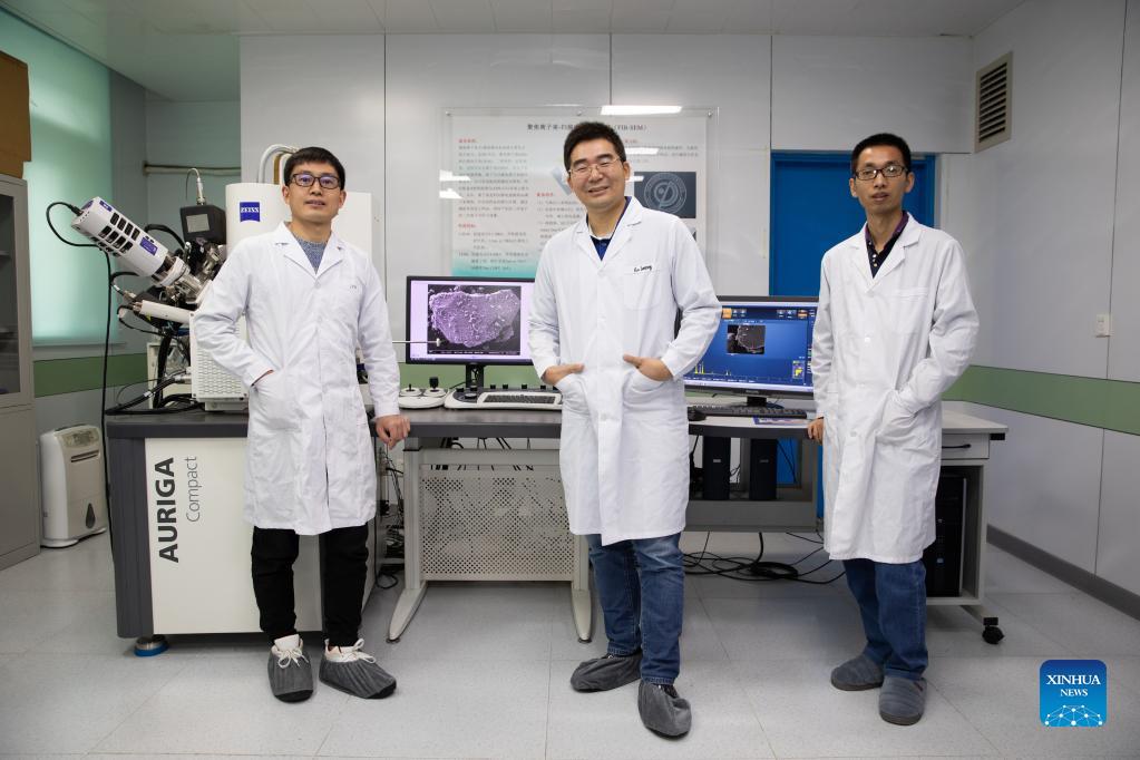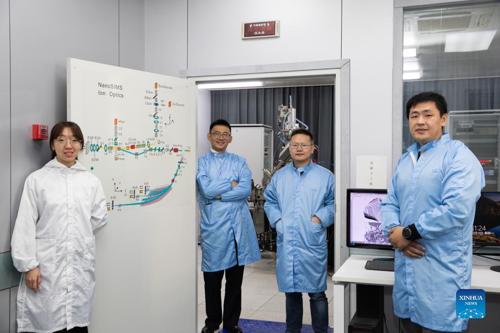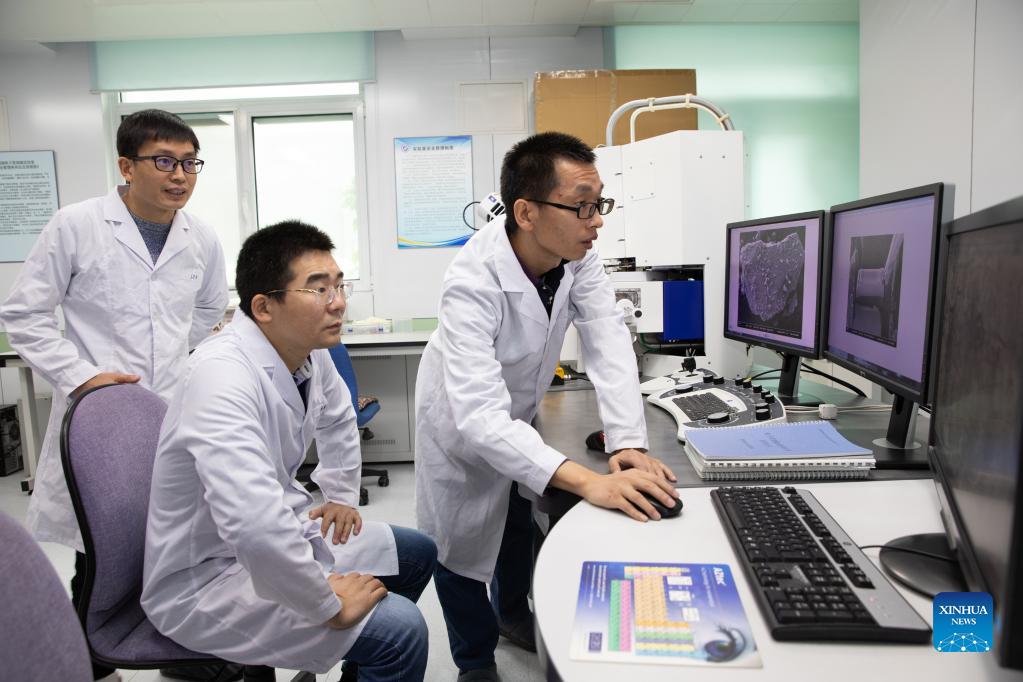Researchers discuss experiment progress at the Institute of Geology and Geophysics of the Chinese Academy of Sciences in Beijing, capital of China, Oct. 18, 2021. Chinese researchers have studied the lunar samples brought back by the Chang'e-5 mission and dated the youngest rock on the Moon at around 2 billion years in age, extending the "life" of lunar volcanism 800-900 million years longer than previously known. The study, conducted mainly by a research team at the Institute of Geology and Geophysics (IGG), Chinese Academy of Sciences (CAS), was presented in three Nature papers and published online Tuesday. (Xinhua/Jin Liwang)