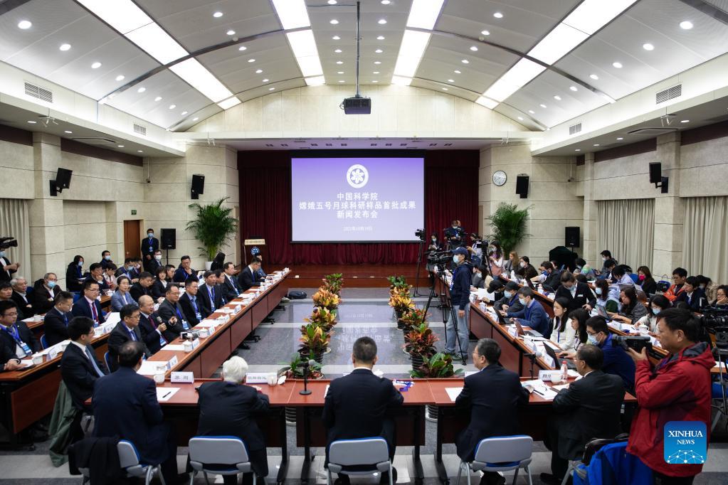 Photo taken on Oct. 19, 2021 shows the scene of a press conference held at Institute of Geology and Geophysics of the Chinese Academy of Sciences in Beijing, capital of China. Chinese researchers have studied the lunar samples brought back by the Chang'e-5 mission and dated the youngest rock on the Moon at around 2 billion years in age, extending the "life" of lunar volcanism 800-900 million years longer than previously known. The study, conducted mainly by a research team at the Institute of Geology and Geophysics (IGG), Chinese Academy of Sciences (CAS), was presented in three Nature papers and published online Tuesday. (Xinhua/Jin Liwang)