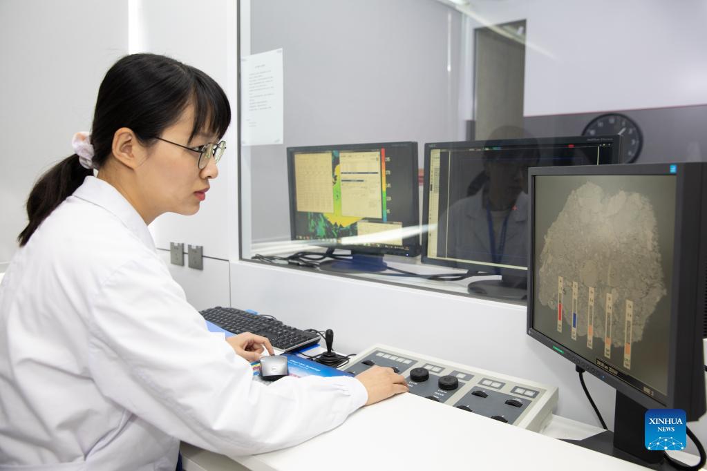 A researcher conducts an experiment at the Institute of Geology and Geophysics of the Chinese Academy of Sciences in Beijing, capital of China, Oct. 18, 2021. Chinese researchers have studied the lunar samples brought back by the Chang'e-5 mission and dated the youngest rock on the Moon at around 2 billion years in age, extending the "life" of lunar volcanism 800-900 million years longer than previously known. The study, conducted mainly by a research team at the Institute of Geology and Geophysics (IGG), Chinese Academy of Sciences (CAS), was presented in three Nature papers and published online Tuesday. (Xinhua/Jin Liwang)