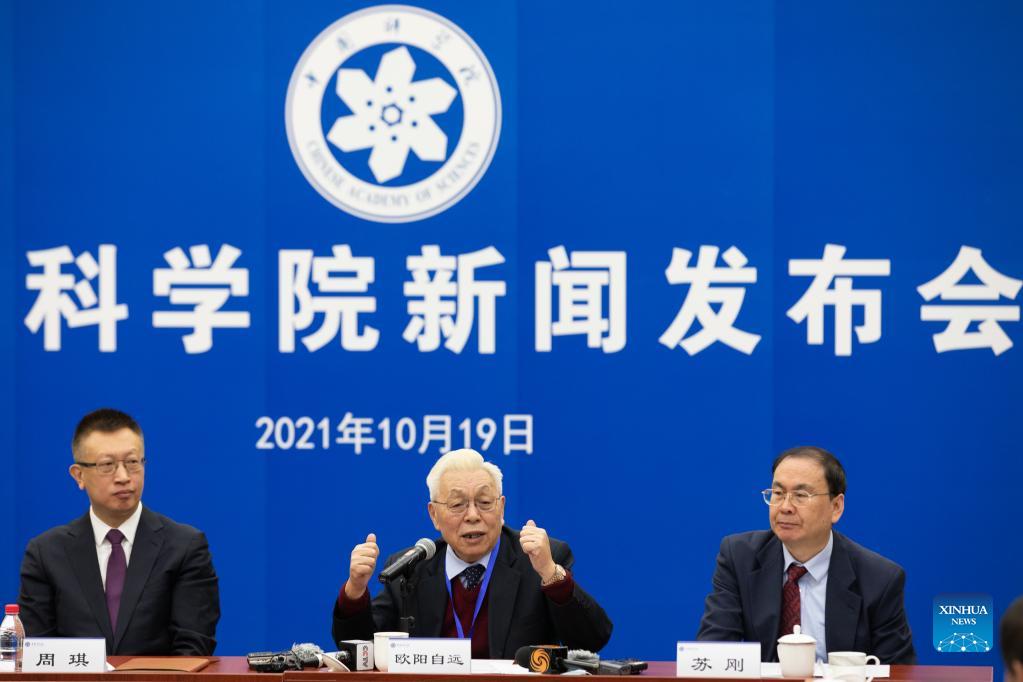 Ouyang Ziyuan (C), an academician with the Chinese Academy of Sciences (CAS), speaks during a press conference held at Institute of Geology and Geophysics of the Chinese Academy of Sciences in Beijing, capital of China, Oct. 19, 2021. Chinese researchers have studied the lunar samples brought back by the Chang'e-5 mission and dated the youngest rock on the Moon at around 2 billion years in age, extending the "life" of lunar volcanism 800-900 million years longer than previously known. The study, conducted mainly by a research team at the Institute of Geology and Geophysics (IGG), Chinese Academy of Sciences (CAS), was presented in three Nature papers and published online Tuesday. (Xinhua/Jin Liwang)